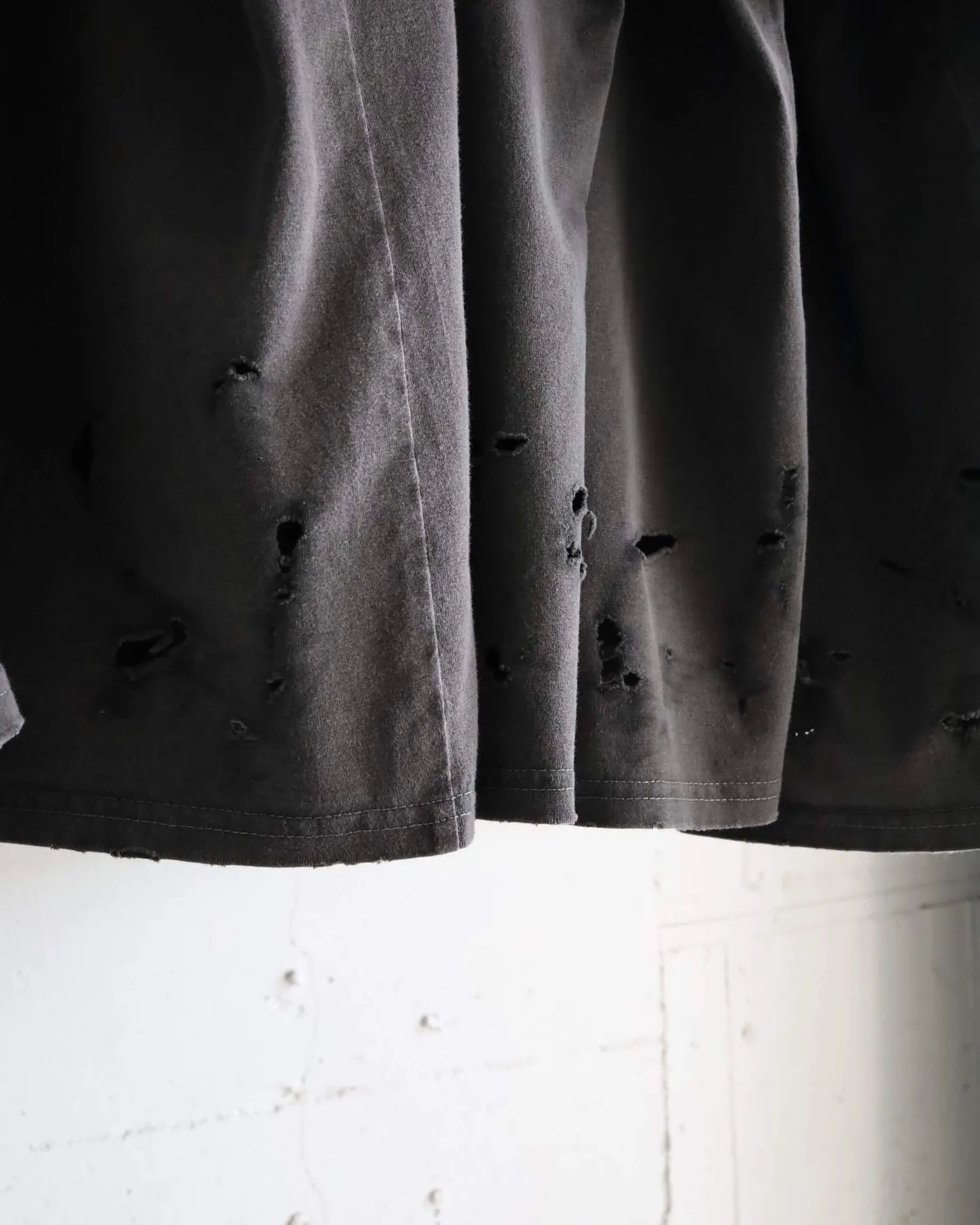 黒の顔料染めを施した後、バイオソーピングすることで色を落とし、1点1点手作業でダメージを加えています。