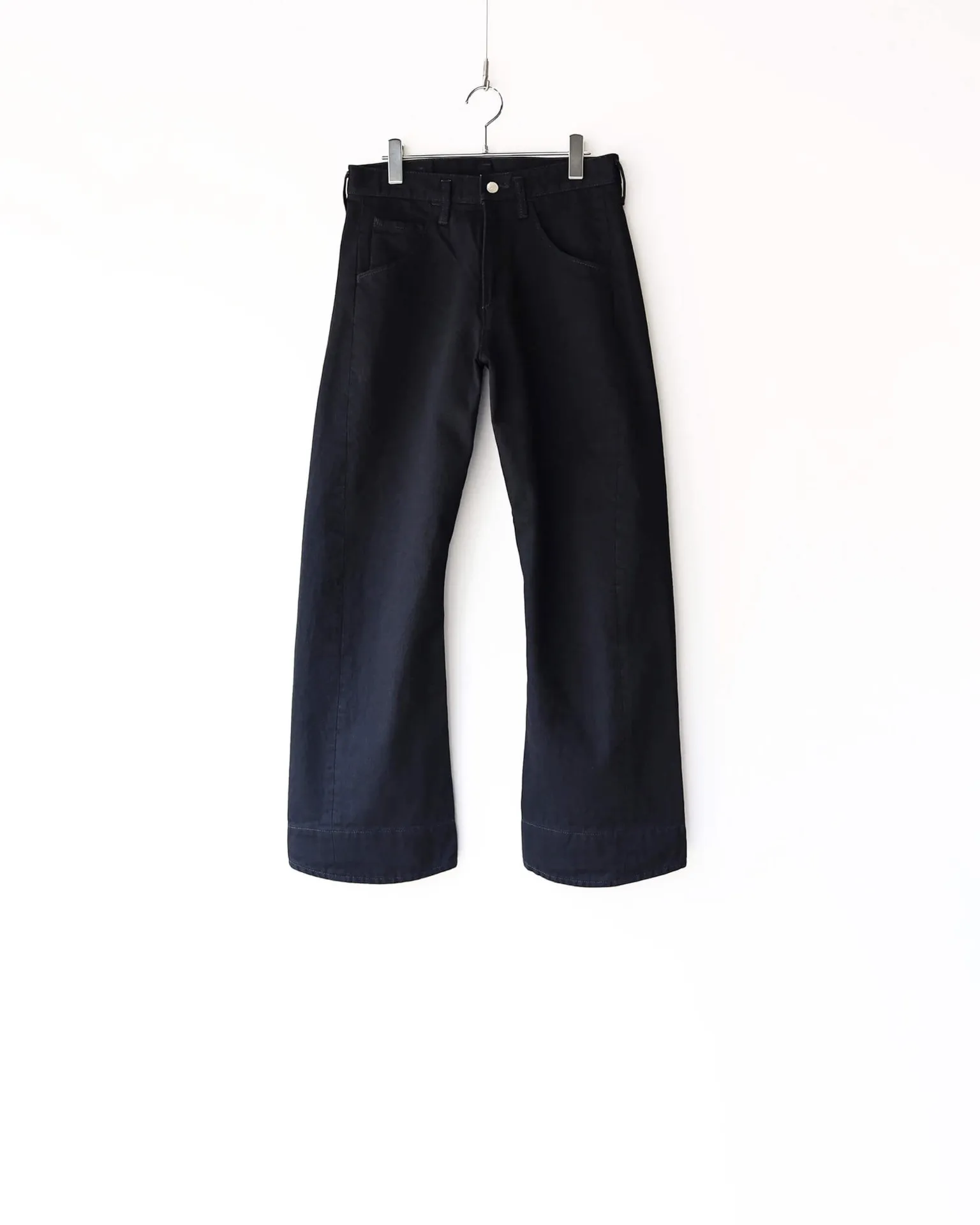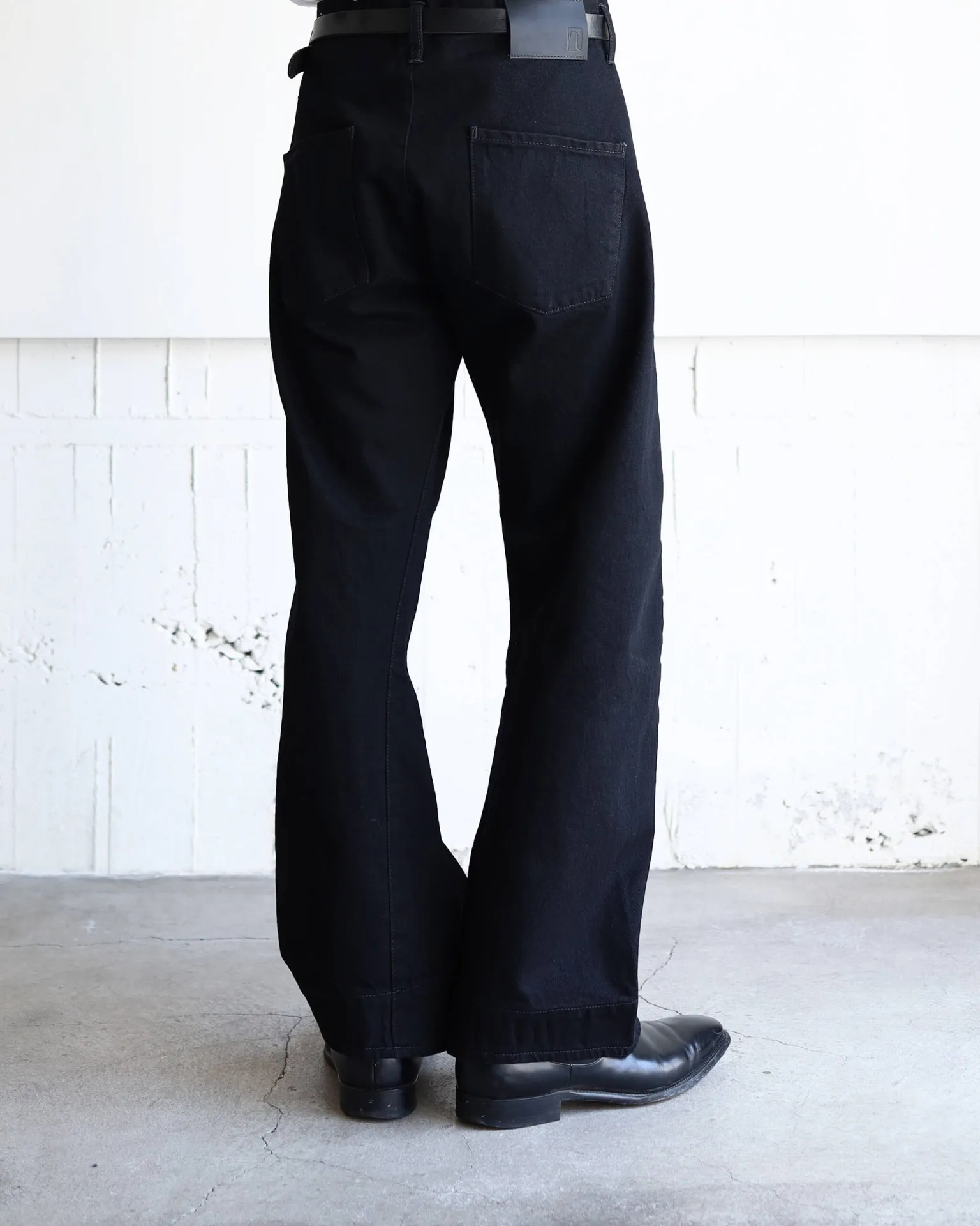 独特な裾のカッティングやバックヨークを廃した後身頃など、ミニマルながら風変わりなデニムパンツに仕上がっています。