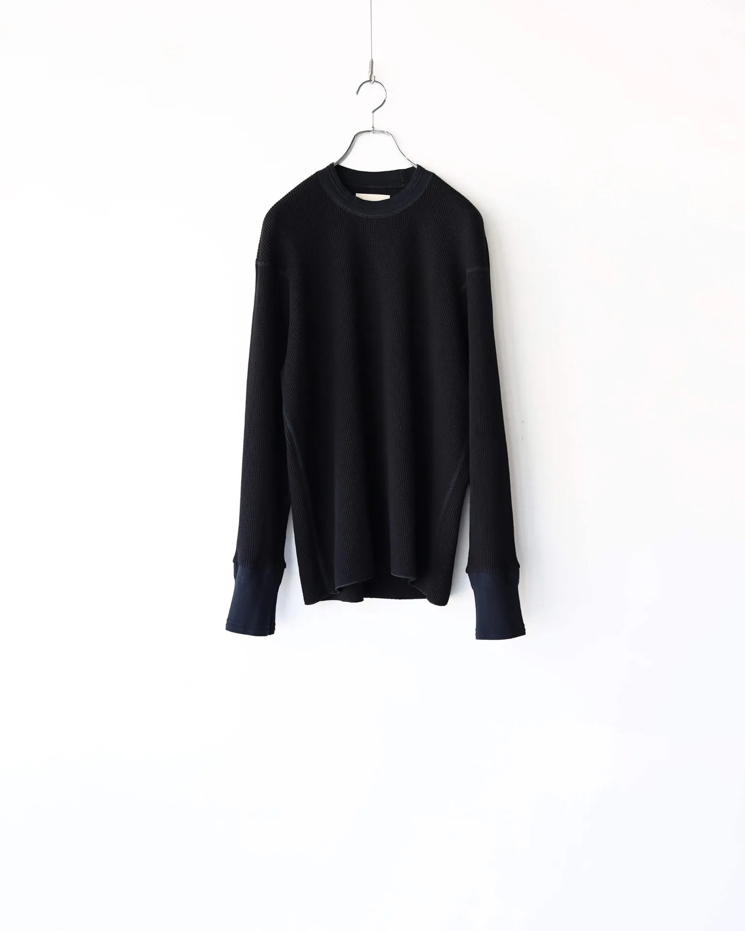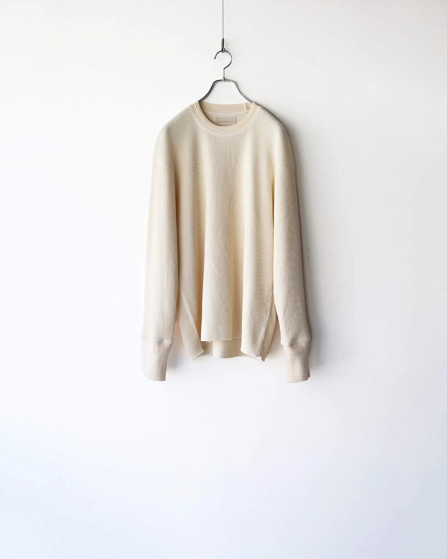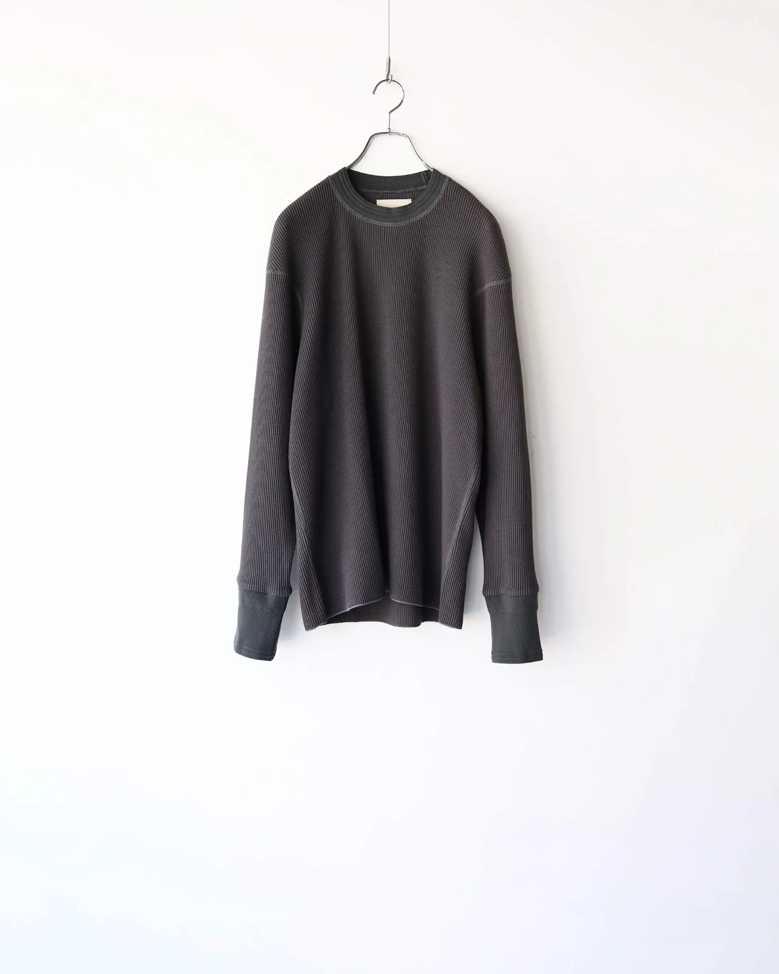 迫力あるワッフル地の立体感。首元や袖のリブの美しく力強い編み地。
