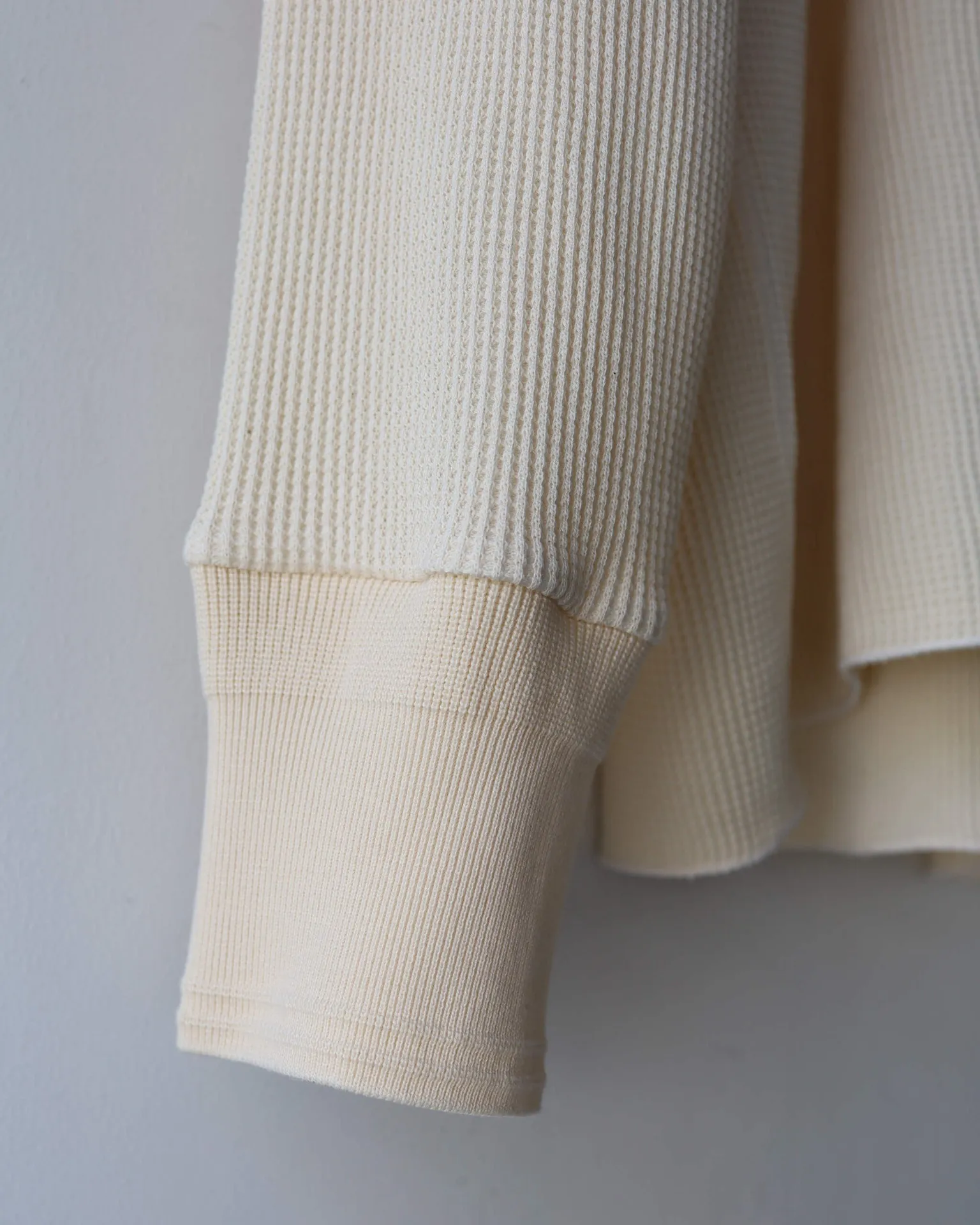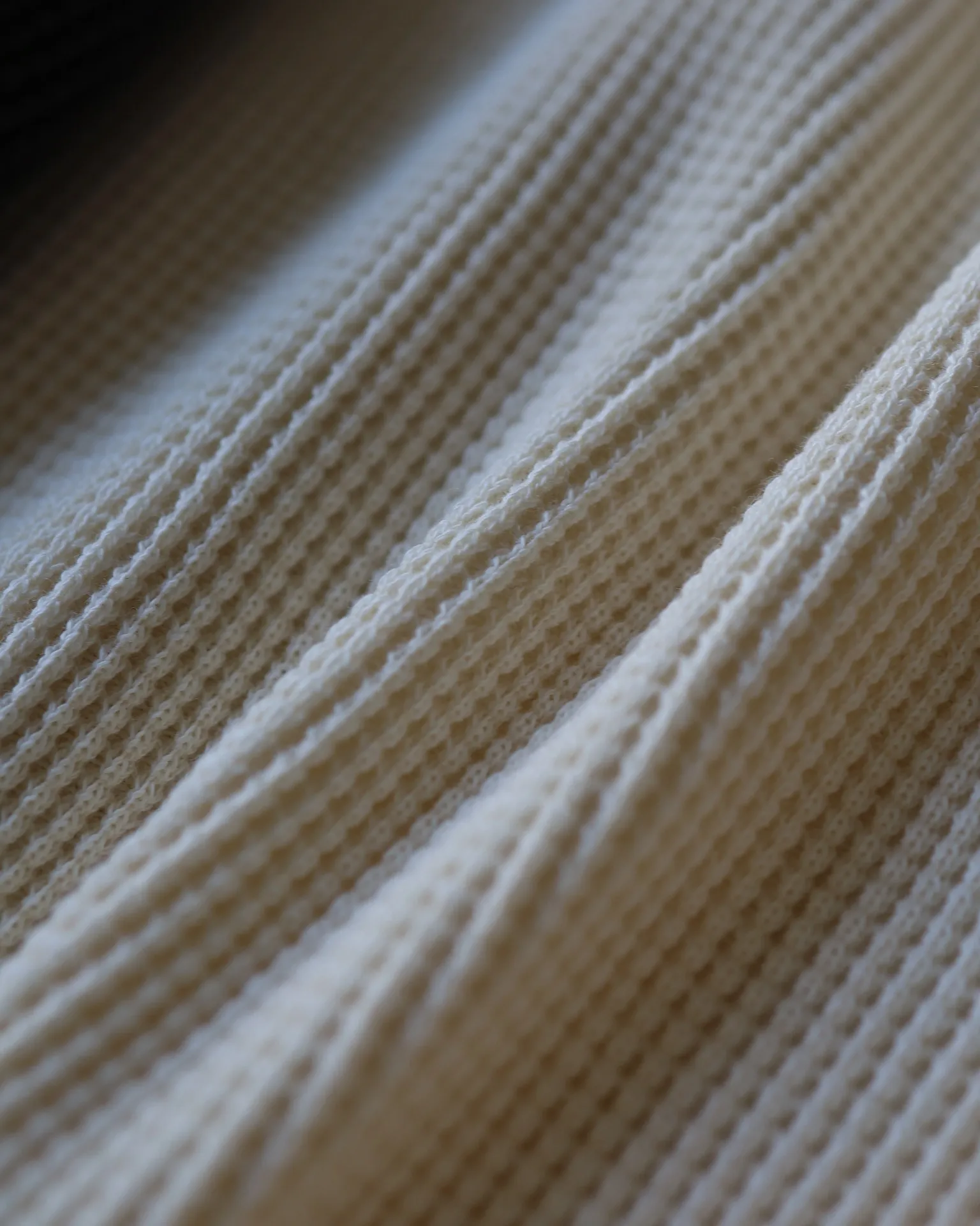 表面の力強い凹凸感、肌馴染みが良い柔らかさ、それでいてキックバックが効き、縮みにくく洗濯耐久性が高い…といった、理想のワッフルの条件をコットン100%で実現。