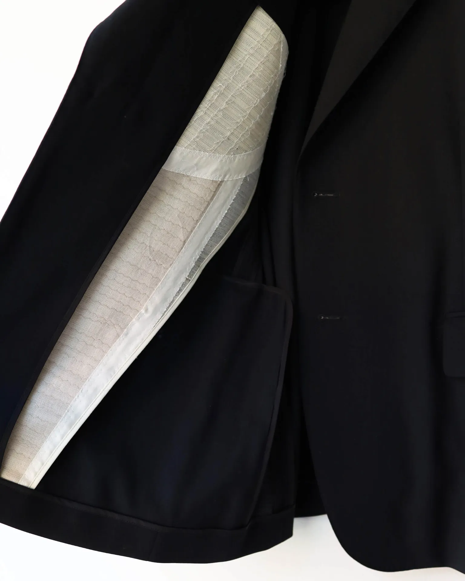 フル毛芯を「魅せる」つくりや、随所に職人による手仕事を感じられる本格的な1着です。
