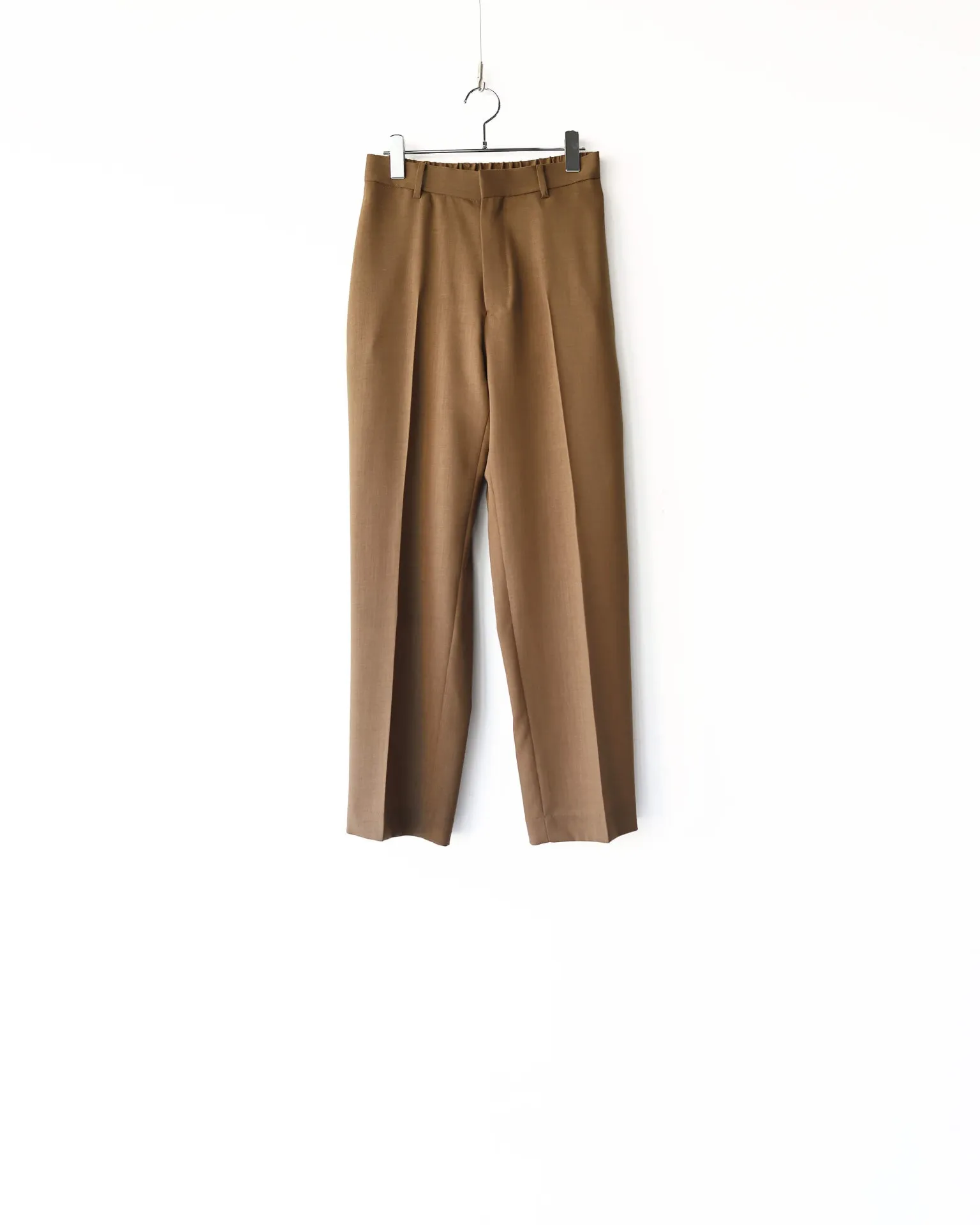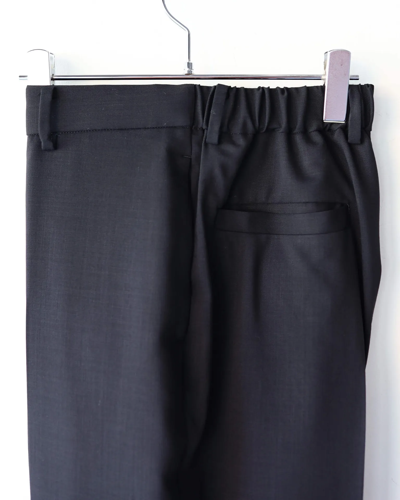 パンツもお馴染みの美しいシルエットと丁寧な縫製、後ろのウエストがゴム仕様になったイージーな履き心地。